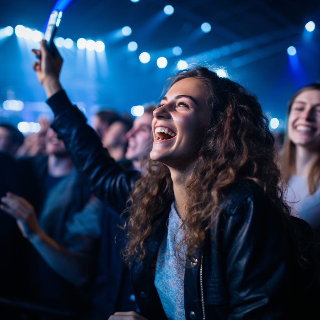 Scene: An energetic concert atmosphere with focus on one individual in the front row. The stage and performing band are in the background, but the main emphasis is on the person's intense emotional reaction. Details: This person is portrayed enjoying the music but in a more relaxed, reserved manner. They're smiling, possibly holding a beverage, maybe capturing a picture or video with their phone. They're dressed casually, and their demeanor suggests they're content and enjoying the experience but without the intense emotional engagement seen in the first image. The surrounding crowd is more visible, indicating the person's greater awareness of their surroundings as opposed to being wholly absorbed in the music.