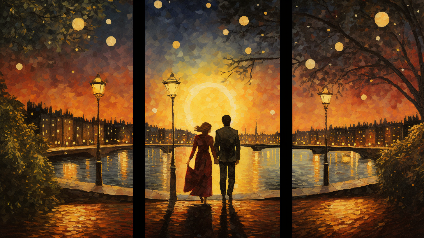 Create an image vertically split into three panels - Panel 1: sunrise with a young couple walking on a bridge. Panel 2: sunset with a couple at a Parisian café. Panel 3: starry night with an older couple and two children against a Grecian backdrop. --ar 16:9