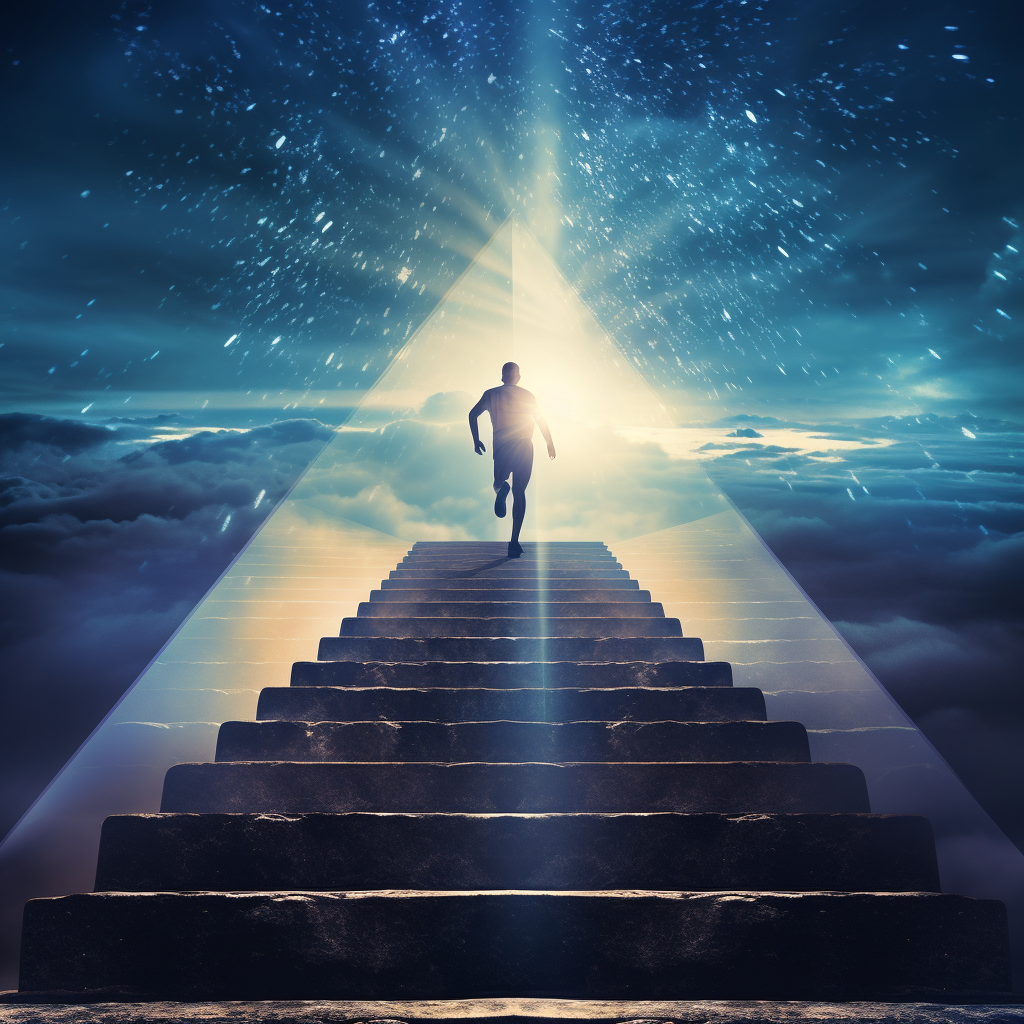 Create an image that visualizes the concept of speed and immediate action in achieving one's aspirations. Depict a figure running swiftly up a staircase that transforms into an upward arrow, symbolizing progress and urgency. The steps should be lit with a warm glow, indicating clarity and focus, with the top of the staircase merging into a bright horizon that represents the aspirational goals." - Image #3 @sridvana
