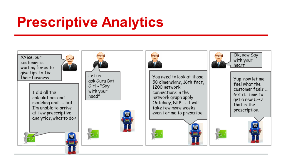 XYise: "I did all the calculations and modeling… but I'm unable to arrive at a few prescriptive analytics, what to do?"Wiggs: "Let us ask Guru Bot - 'Say with your head.'"