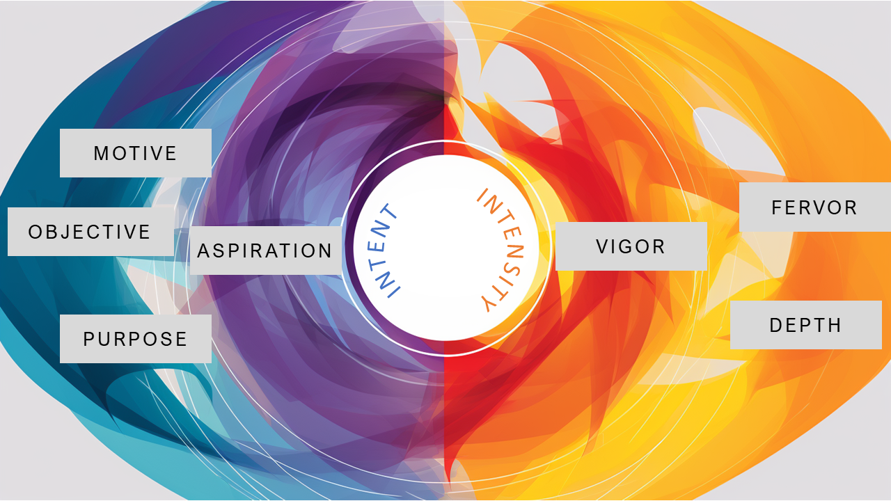 Create an image that visually represents the interplay between 'intent' and 'intensity' in a professional context. Showcase these abstract forces as dynamic, intertwining elements shaping the path to success. Incorporate visual cues that symbolize objectives ('intent') and the energy of actions ('intensity'), while also hinting at the diverse professional domains where these forces come into play. --ar 16:9