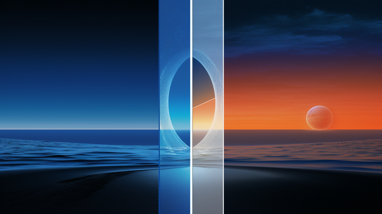 Imagine a clear vertical split screen divided into two distinct frames: Left and Right. Left Frame (Meaning Related): Background: A deep, introspective blue gradient. Foreground Imagery: Ethereal symbols representing the depth of meaning. Picture a fingerprint symbolizing identity, a kaleidoscope showcasing multiple perspectives, and a balanced scale embodying belief. Right Frame (Form Related): Background: A lively, energetic orange gradient. Foreground Imagery: Icons that visualize the tangibility of form. Imagine a sound wave for auditory precision, flowing musical notes capturing rhythmic essence, and a standout star or diamond signifying uniqueness. Centerpiece: Situated in the middle, imagine an ornate, radiant halo or nameplate in gold. This centerpiece gracefully overlaps both the left and right frames, acting as a bridge between the two. The part of the halo or nameplate over the left frame has a subtle ethereal glow, while the part over the right frame exudes a more vibrant shimmer. The design should echo the harmonious marriage of deep introspection with dynamic creativity, symbolizing the union of meaning and form in the art of naming. --ar 16:9