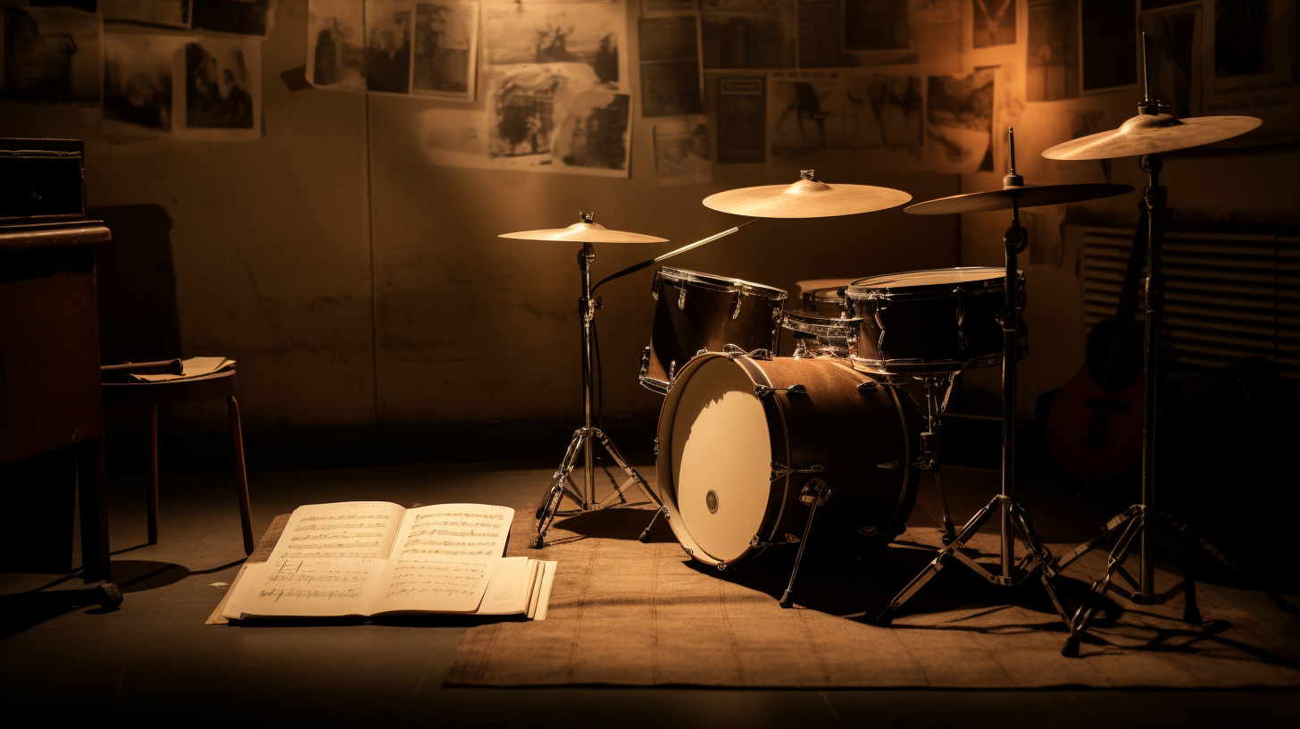 A dimly lit room, suffused with the gentle glow of sunset filtering through a window. In the foreground, a set of drumsticks rests on an open, aged notebook filled with handwritten lyrics and musical notes, a testament to past compositions. Nearby, a faded band poster from one of the earlier performances leans against the wall. In the midground, a newly polished drum set awaits, symbolizing the renewed journey. Off to the side, a framed advertisement highlights the logo of Rajeev and Bruce's new music school chain. The room's atmosphere is a mix of nostalgia and anticipation, capturing a sense of past achievements and the excitement of new beginnings. Shadows and light play across the scene, reflecting the ups and downs, the pauses and the play-ons of the musical journey. --ar 16:9