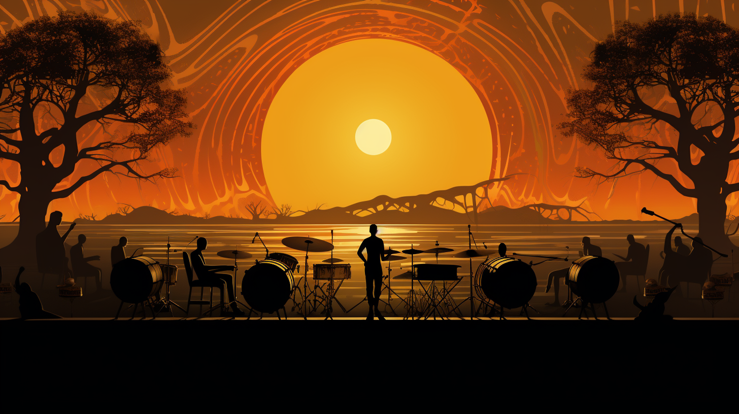 A surreal landscape at sunset where drum sets act as trees, musical notes float in the air like birds, and the ground pulsates with rhythmic patterns. In the heart of the scene stands a majestic figure, symbolizing the guru or teacher, holding a guiding light that illuminates a path leading to a stage. On this stage, a band performs, their silhouettes casting long shadows of camaraderie and unity. All of this is set under a sky painted with streaks of passionate red and unwavering blue, encapsulating the essence of aspirations, mentorship, and musical bonds. --ar 16:9