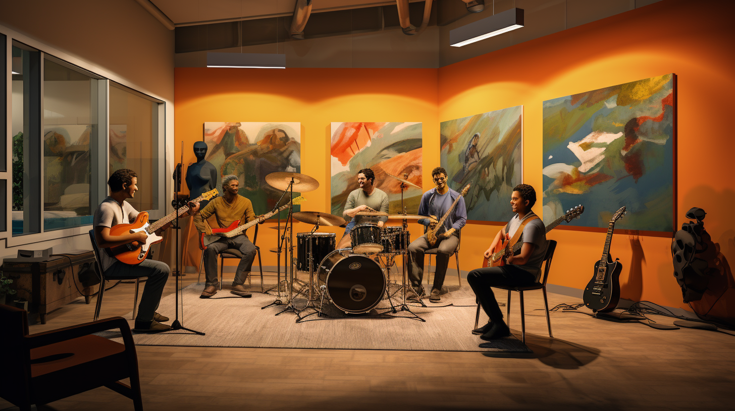 Envision a dynamic and lively rehearsal space. In the center, four passionate musicians (representing the amateur band) are deep in their element, engrossed in learning and practicing. Two of the figures hold guitars, one is poised over a traditional drum kit, while another hovers over a keyboard or bass guitar. On the sidelines, two teachers (representing Rajeev and Bruce) guide, motivate, and occasionally join in with their own instruments. Surrounding the group, sketches of song covers, lyrics, and musical notes flutter, symbolizing the rigorous training process. The ambiance should radiate dedication, camaraderie, and the pure joy of making music together. --ar 16:9