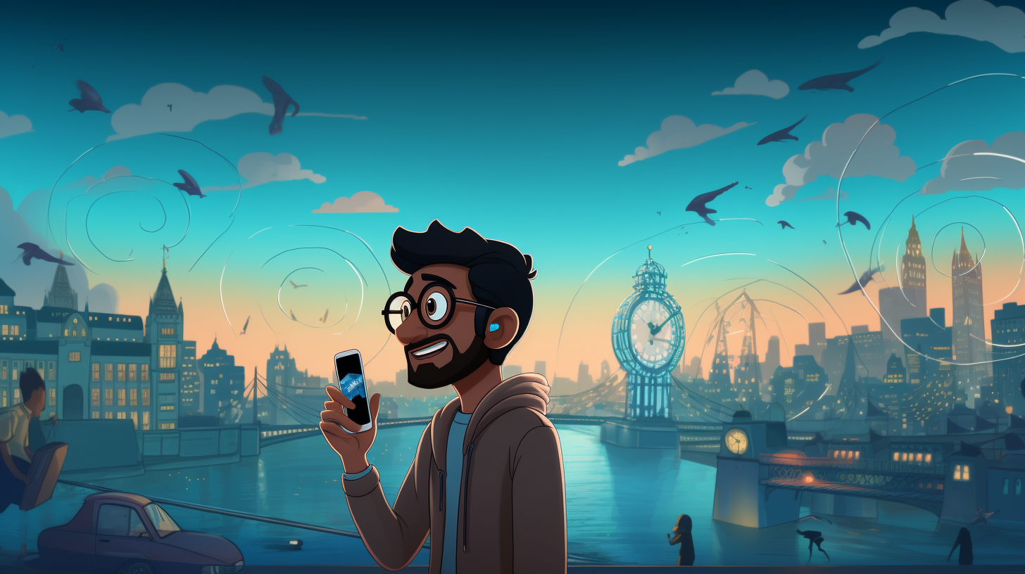 Picture a scene set in London with the iconic London skyline in the backdrop. A person (representing you) stands with an expression of surprise, holding a mobile phone close to the ear. On the phone's screen, visualize Rajeev's animated face, brimming with excitement. Floating around Rajeev's depiction, incorporate subtle symbols of musical notes, a small steel and rubber drum kit, and a hint of a stage with footlights, representing the idea of a performance. The atmosphere should convey a sense of anticipation and the unexpected twist in the story. --ar 16:9