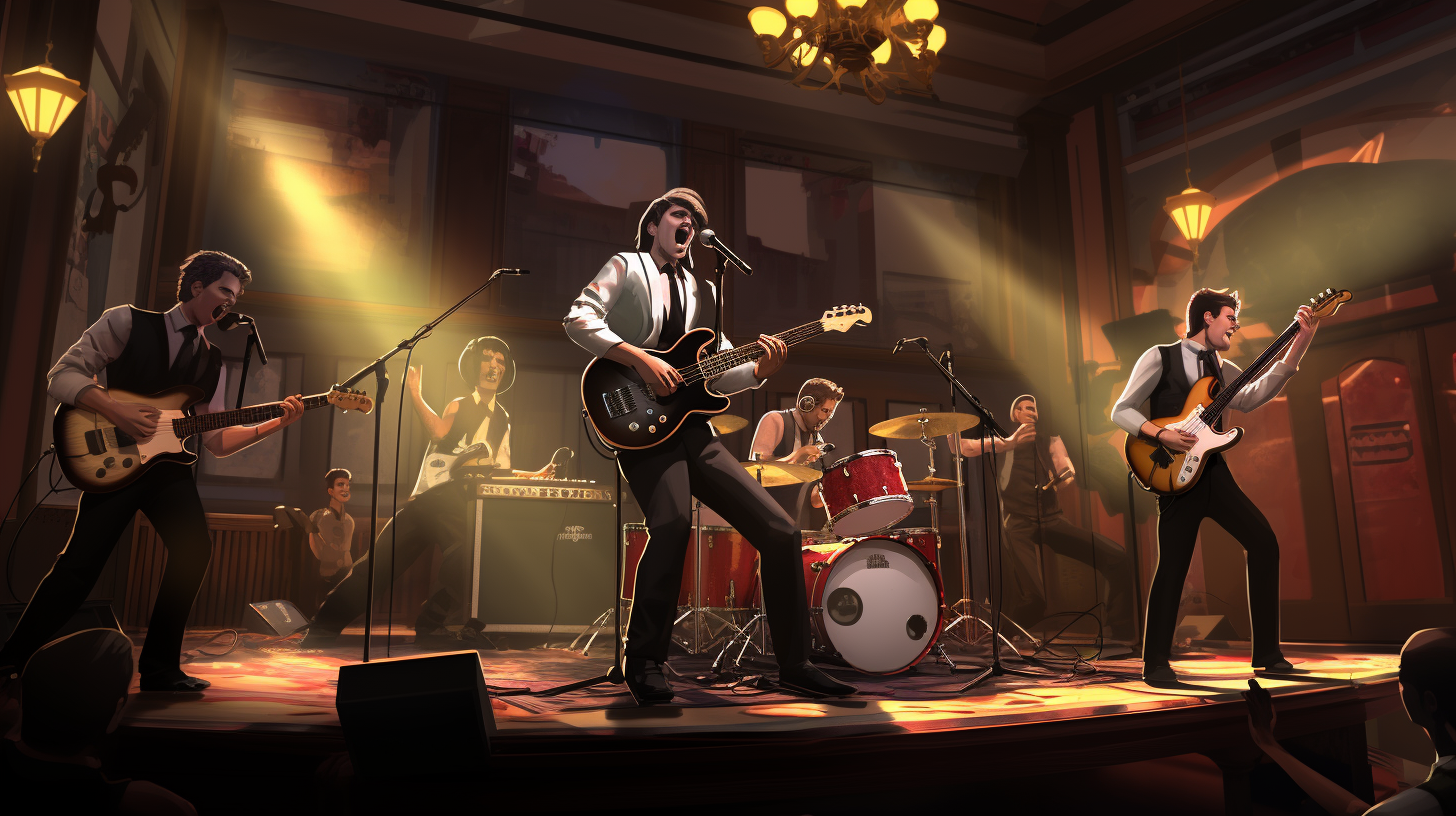 Visualize a classic rock band's exhilarating debut performance, set in a quaint hotel/restaurant stage setting: Front and center, a lead vocalist passionately belts out lyrics, holding a microphone in one hand and wielding a guitar with the other. Their facial expressions exude intensity and emotion. To either side of the lead vocalist, two guitarists energetically strum and riff away. One leans back, immersed in a powerful guitar solo, while the other is vibing to the rhythm, foot tapping and head nodding to the beat. Positioned slightly elevated at the back of the stage is the drummer, seated confidently on a throne. The drummer has a focused demeanor, sticks in hand, dynamically hitting each drum and cymbal. Around them, the drum kit resonates with each beat, embodying the heartbeat of the band's performance. The stage is bathed in a warm, moody glow, with multicolored lights spotlighting each band member, casting dramatic shadows and adding to the ambiance. In the audience, an enthusiastic mix of friends, family, and restaurant patrons passionately engage with the music. Some are on their feet dancing, others are clapping along, a few whistle in admiration, and several capture the magic with their phones. The atmosphere is electric, filled with the raw energy of live music, and the genuine excitement of a band's first major outing. This moment captures the culmination of dedication, training, and the sheer joy of performance. --ar 16:9