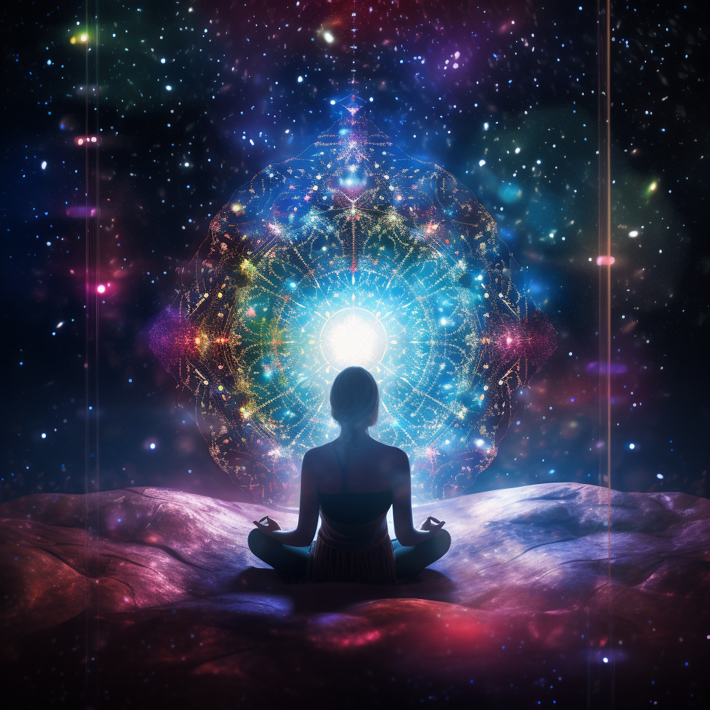 Create an image of a transparent human silhouette in the lotus position during meditation. Inside the silhouette, show a vibrant mini-universe: galaxies, various planets, stars, and cosmic lights coexist with the human anatomy like veins, heart, and brain, illustrating the inner cosmos. Outside the silhouette, the serene environment of a peaceful meditation space with ethereal light, floating nebulae, and a sense of infinite tranquility is depicted.