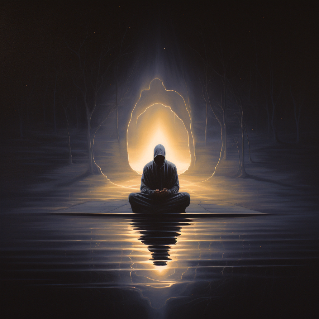 Generate an image of a lone figure sitting peacefully in meditation, immersed in an all-encompassing void. From this deep, tranquil darkness emerges a gradual glow, a soft, radiant light that begins to envelop the figure, symbolizing an enlightening transition from the void to a state of illumination and clarity.