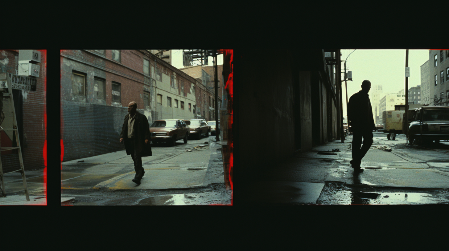 Layout: Three vertical frames, side by side, forming a split screen. Backgrounds: Frame 1 (leftmost): Background: A muted still from the movie "Kuruthipunal/Drohkaal" - perhaps a tense scene, with characters immersed in a covert operation. Frame 2 (middle): Background: A grainy, urban backdrop from "The Departed". This could be a dimly lit alleyway or the interior of a gritty police department. Frame 3 (rightmost): Background: An atmospheric shot from "Tinker Tailor Soldier Spy", possibly a smoke-filled room with 70s decor or a vintage spy office setting. Foreground (spanning across all three frames): Silhouettes of two individuals, one being a spy and the other being a mole. The spy, dressed in a trench coat and possibly a fedora, is shown in a posture of active listening or investigating, perhaps holding a briefcase or a listening device. The mole, on the other hand, appears to be whispering secrets, leaning in close to the spy, or passing over some confidential information. --ar 16:9