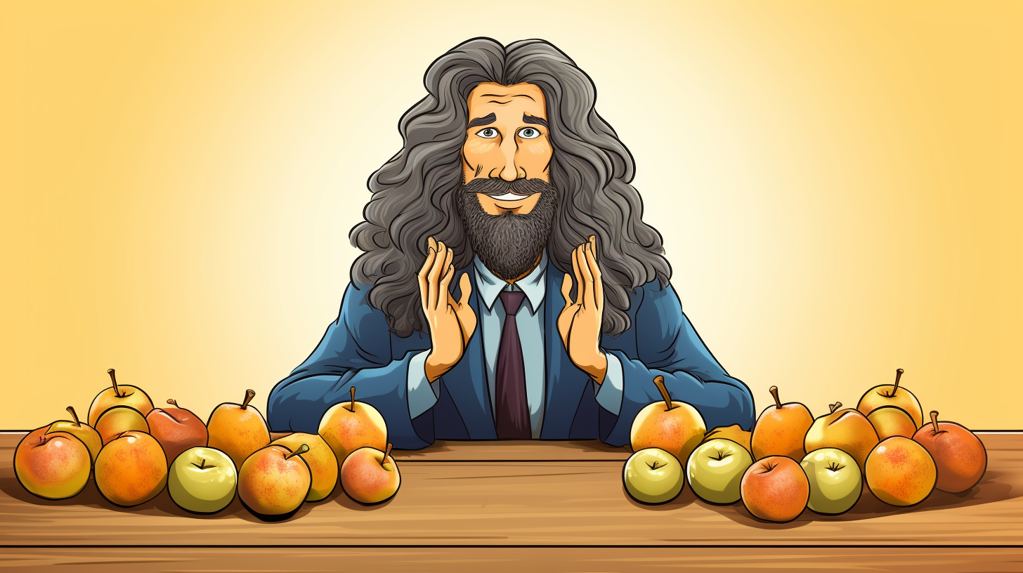 Create a comical cartoon-style image of the corporate boss, Wigss, seated at the head of a boardroom table, wearing a long-haired, flowing spiritual guru wig, and holding a piece of fruit in one hand. He should appear in a contemplative and serene pose, as if he's about to share profound wisdom. Around the table, his employees, Diggz and Waggz, should be sitting with exaggerated expressions of confusion and skepticism, rolling their eyes or exchanging knowing glances, as they react to his spiritual coaching session. The boardroom should have subtle humorous details, like posters of corporate jargon transformed into spiritual mantras on the walls. --ar 16:9